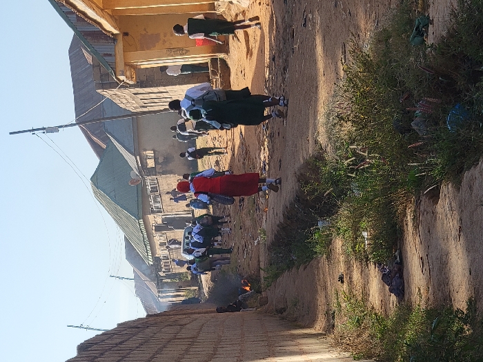 A street scene depicts a group of people walking on a dirt road alongside buildings. Most are in school uniforms. The structures are simple, likely residential or school buildings. The landscape is dry and earthy, with sparse vegetation on the side of the road. The sky is clear, suggesting a sunny day. The image might be taken in an African nation.