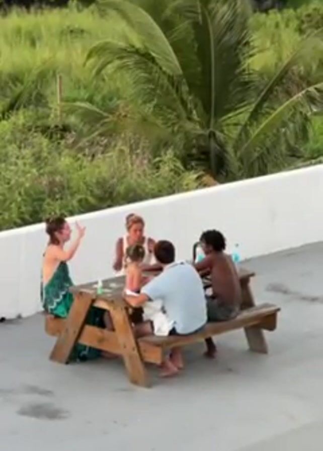 On a rooftop surrounded by a white wall and lush green vegetation, a group of five individuals is gathered around a wooden picnic table. A woman in a green dress is seated on the left, engaged in conversation with the others. Next to her is another woman with her hair up, who appears to be interacting with a young child seated between them. Across from them are two men. One man, wearing a light blue shirt, is facing the child and seems to be tending to their needs. The other man, shirtless, is seated on the edge of the bench, engaged in the conversation. There are water bottles and other items on the table. The environment is outdoors, with a vibrant green backdrop of trees and foliage, including a prominent palm tree. The setting suggests a relaxed, possibly social gathering.