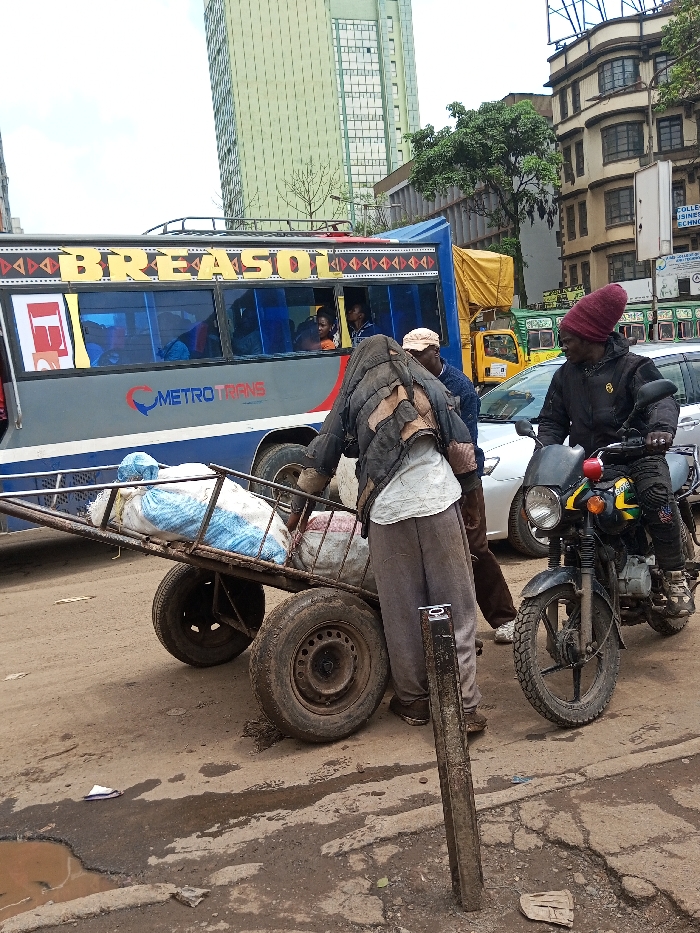 A street-level photograph captures a busy urban scene in Nairobi, Kenya. In the immediate foreground, an unpaved, pothole-ridden road with visible debris and water accumulations is present. Three adult males dominate the central composition. A male figure, wearing a tattered dark jacket over a light shirt and grey trousers, stands facing away from the camera, leaning over a rusty, four-wheeled handcart loaded with multiple white and light-blue sacks. To his right, a second male, wearing a light-colored cap, is partially visible. Further to the right, a third male, identified by a prominent red knitted beanie, dark jacket, and dark trousers, sits on a black Bajaj Boxer motorcycle, looking towards the handcart. In the mid-ground, a blue and grey "METRO TRANS BREASOL" public transport bus (matatu) is positioned on the left, with several passengers discernible through its tinted windows. Behind the individuals, a silver sedan and a yellow truck are partially visible, indicating traffic. The background features a blend of architecture: a towering, modern skyscraper with green-tinted windows on the far left, and an older, multi-story beige building with distinct curved architectural elements and a partially obscured "COLLEGE OF BUSINESS TECHNOLOGY" sign on the right. Sparse tree foliage is visible between the buildings. A rusted, square metal pole stands upright in the immediate foreground. The sky appears overcast.