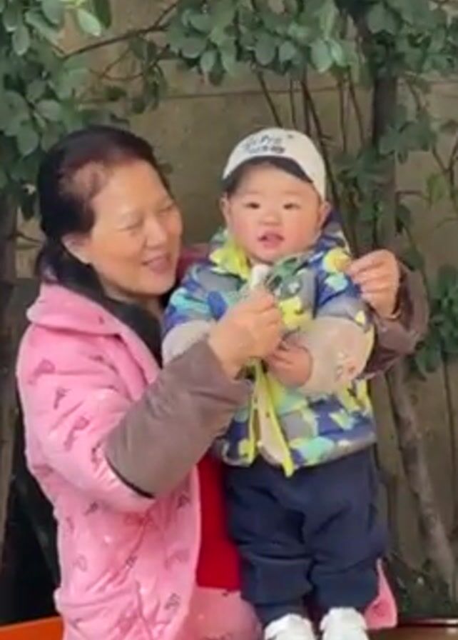 A woman in a pink quilted robe holds a toddler wearing a colorful jacket, navy pants, and a white baseball cap, on a wooden table outdoors