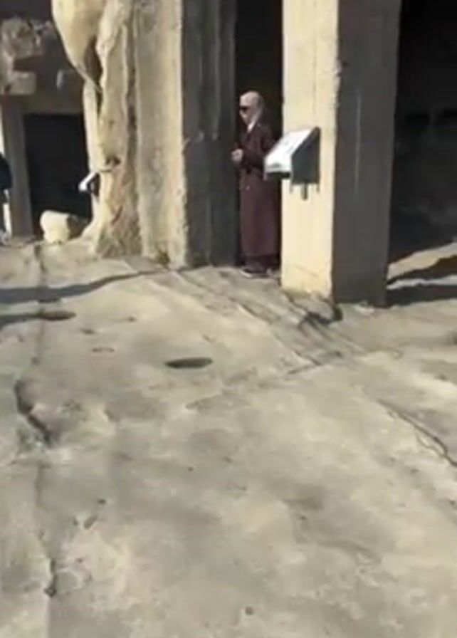 sunny day at a site with rock-cut structures, possibly a cave complex or ancient ruins. The ground is stone, with weathered surfaces and what appear to be carved holes. Several people are seen walking around. One woman wearing a hijab enters and exits a rock-cut doorway. The camera then moves to a view overlooking a valley with a river, forests, and mountains in the distance. Two people are visible on the edge, taking pictures. Overall, the scene suggests a historical site with natural scenic views.