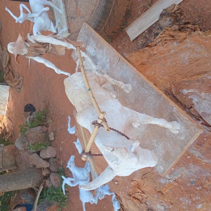The image depicts an outdoor scene in Kakuri Gwari, Nigeria, featuring multiple sculptural pieces. In the foreground and center, a sculpture of a farmer plowing with an ox is prominently displayed. The ox and farmer figures are rendered in a light cream or off-white, textured material, possibly papier-mâché or plaster. The ox is yoked with two light-colored bamboo sticks tied with brown rope, and the farmer figure, wearing a wide-brimmed hat and brown vest-like clothing, holds onto a plow-like structure behind the ox. This main sculpture rests on a rectangular piece of light-colored plywood, which in turn is supported by a large, textured tree stump in the lower right foreground. The ground is reddish-brown dirt, uneven and scattered with small rocks and debris. In the mid-ground and background, several other unfinished or finished white sculptures are visible, predominantly appearing to be horses with riders, scattered directly on the ground. A partial view of a dark tire is visible to the right of the main sculpture's base. To the far left, a tree trunk with sparse green foliage and a pile of rocks are present. The scene is illuminated by natural daylight, indicating an outdoor setting, likely an artist's workshop or display area.