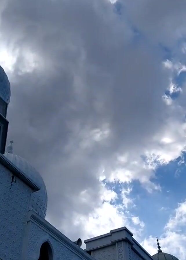 view of a white building with a dome and ornate patterns on a partly cloudy day. The clouds are dark gray and white, against a bright blue sky. The camera angle is looking up. There are no people visible in the frame.