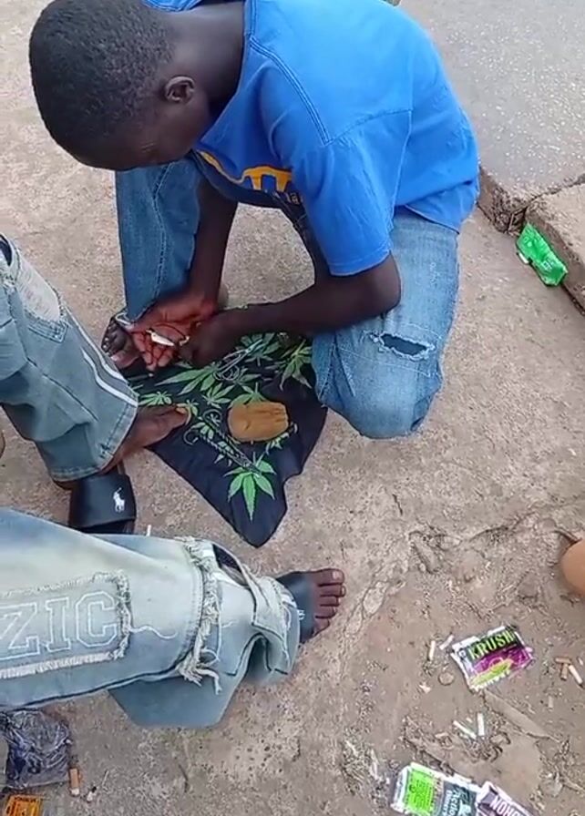 young person squatting on the ground, apparently preparing something on a black cloth with cannabis leaf designs. They are wearing a blue t-shirt and jeans with rips in the knees. There is a brown object and a yellow object on the cloth. The person appears to be using a small pair of scissors. Next to them, someone is sitting with their legs visible. They are wearing ripped jeans and black sandals. Scattered around are various wrappers and what appear to be cigarette butts on the concrete ground.