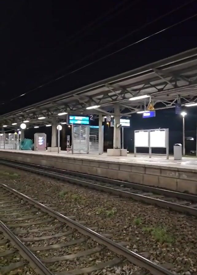 view of a train platform at night. The platform is covered by a metal roof with lights illuminating the area. Train tracks are visible along the side of the platform. Signage indicating platform numbers is present. A person walks by in the latter part of the video.