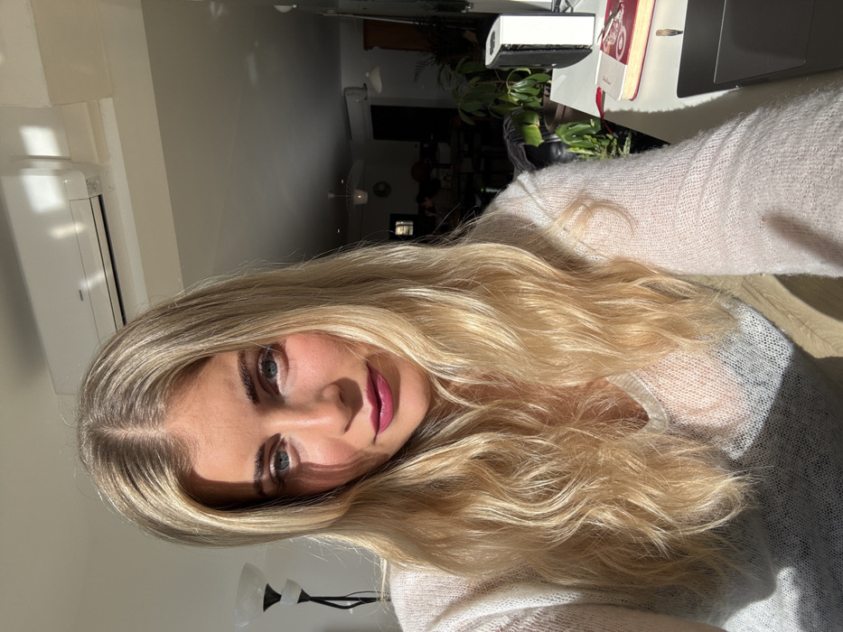 The image displays a young adult female located indoors in the city of Rousset, France. She has long, wavy blonde hair with a central part and blue eyes, directly facing the camera. Her face is illuminated by strong direct sunlight from the left, creating shadows on her left cheek and under her chin. She is wearing purple lipstick and a light-colored, semi-sheer V-neck sweater, with a dark garment visible underneath. To her left, a white wall is visible, featuring a floor lamp with two light fixtures and a white wall-mounted air conditioning unit near the ceiling. To her right, a darker interior space contains multiple potted plants. A white electronic device, possibly a speaker or air purifier, a red-bound notebook, and a partially visible laptop rest on a white surface in the foreground. In the deeper background, an individual is vaguely discernible seated at a table beneath a ceiling-mounted light fixture. The overall scene is characterized by bright sunlight on the subject and the immediate left background, contrasting with the shadowed right background.