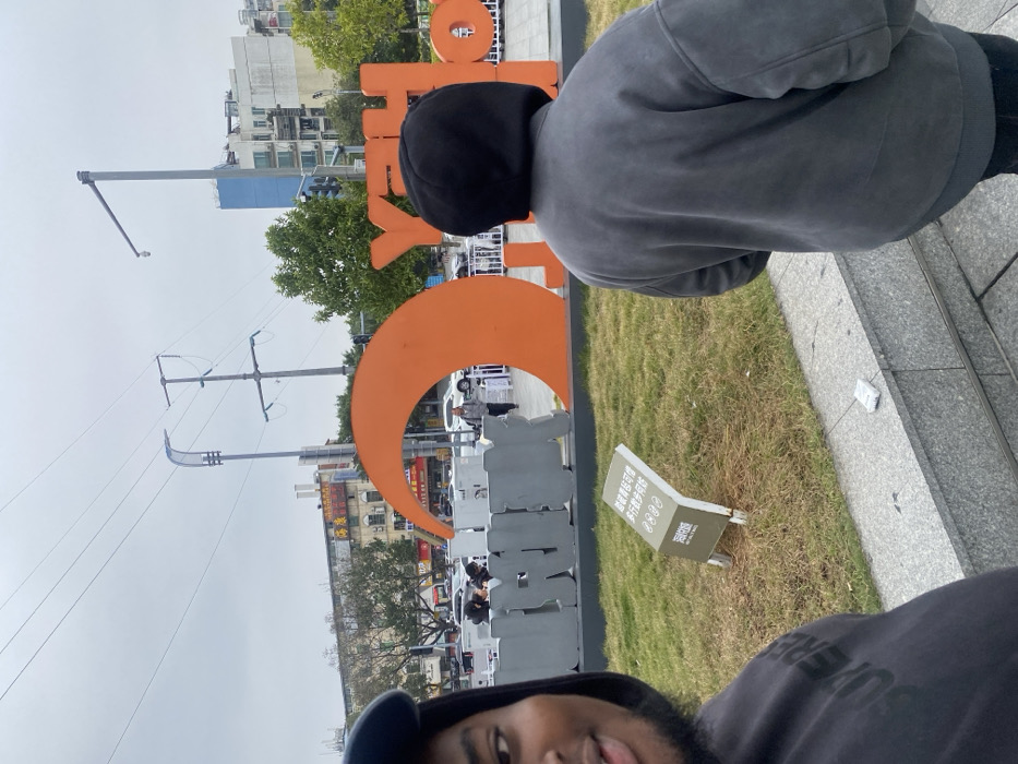 Two people pose for a selfie in front of an orange sign with Chinese characters and a crescent moon shape. Buildings, trees, utility poles, and cars are visible in the background. The ground is a mix of grass and paved areas. A sign is placed on the grass next to the large orange sign. The sky is overcast.