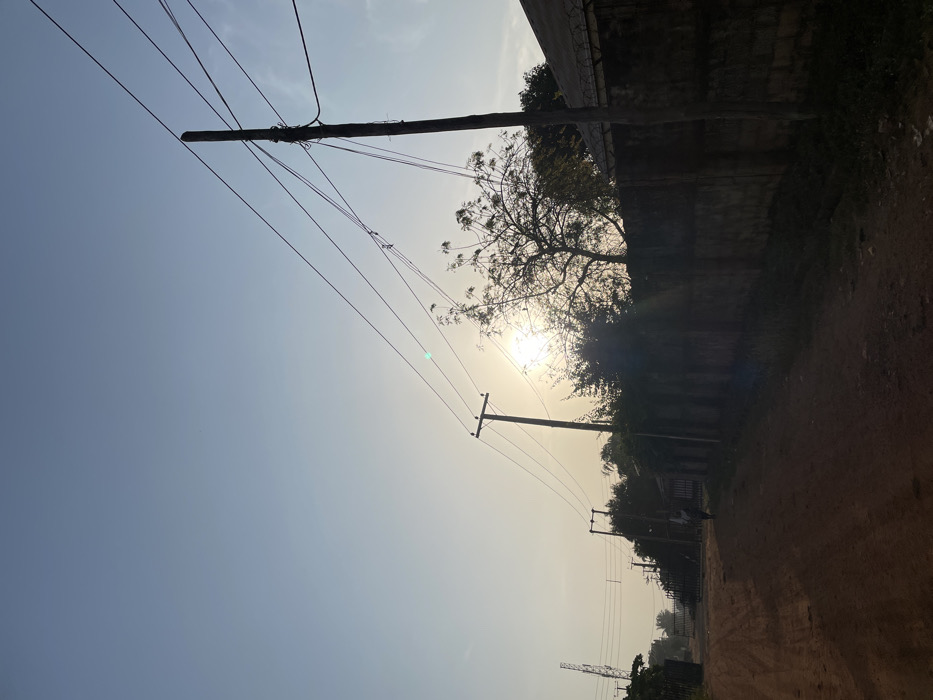 A utility pole extends across a cloudless sky, supporting power lines. Another pole stands closer, partially obscuring the sun. Adjacent to the poles is a walled structure, with trees silhouetted against the sun. A dirt path runs along the right side of the frame, leading away from the viewer. Additional poles and structures can be seen further down the path in the distance.
