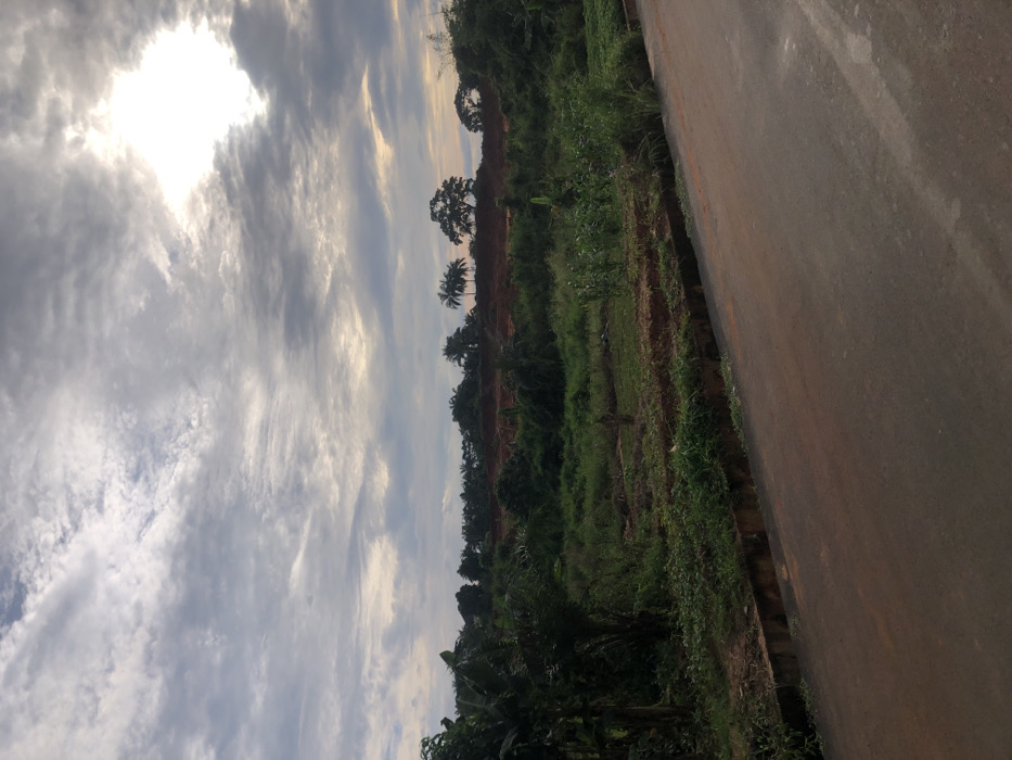 The image displays an undeveloped landscape in Awka, Nigeria, under an overcast sky featuring a mix of grey clouds and a bright, diffused light source in the upper right quadrant
