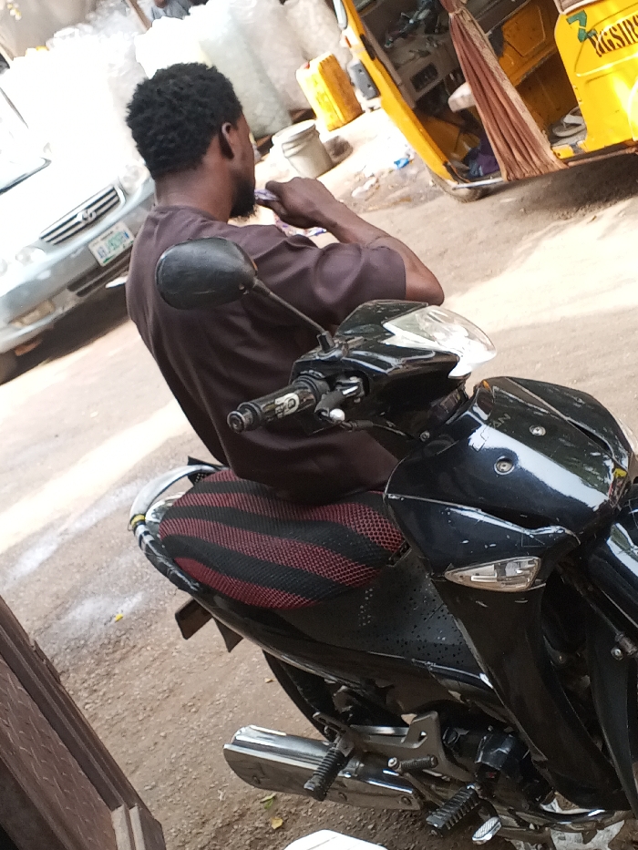 The image captures an outdoor street scene in Minna, Nigeria. In the foreground, a male individual with dark, curly hair, wearing a dark brown short-sleeved top, is seated on a black motorcycle, facing away from the camera. He is actively brushing his teeth with a white toothbrush held in his right hand. The motorcycle features a black and red striped mesh seat cover, a right rearview mirror, and a chrome exhaust pipe. To the left in the background, a silver sedan, likely a Toyota, is parked with a partially visible Nigerian license plate (KGJ...N). To the right, a yellow motorized tricycle, commonly known as a "keke Napep," is visible, displaying "IGSIDE" on its side. The immediate background contains stacked white plastic bags, a yellow jerry can, and a light-colored bucket. The ground is an unpaved, uneven surface.