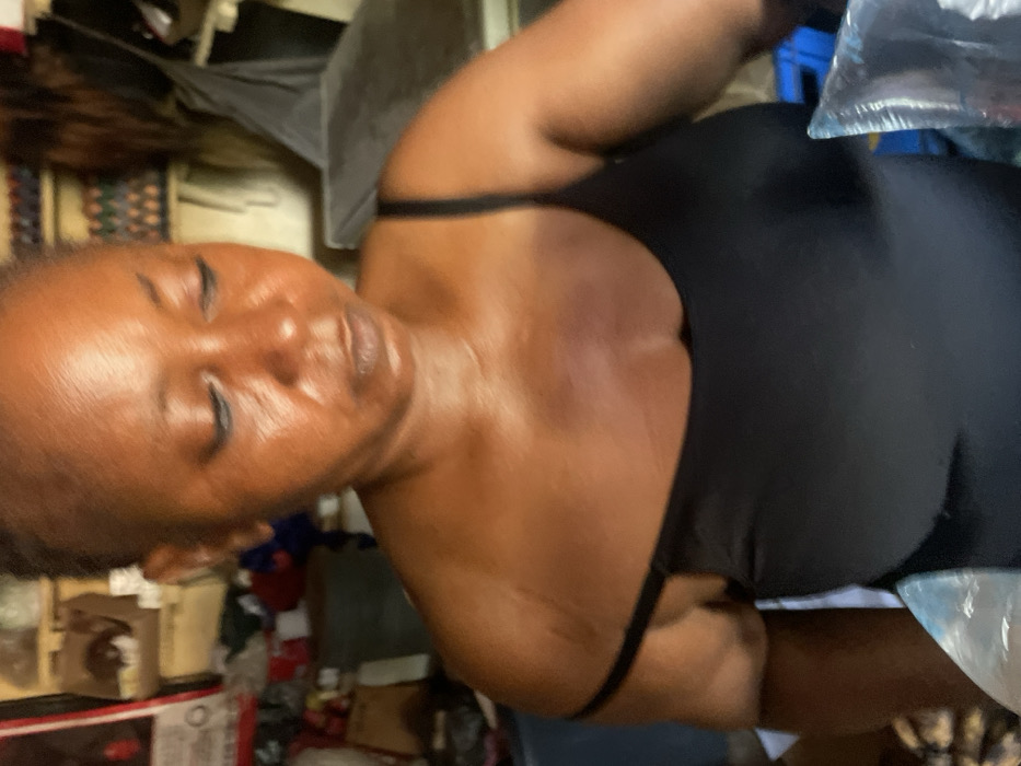 A woman with dark skin wears a black top and looks downward with her eyes closed. The background includes household items and furniture, some covered with fabric or plastic. Her skin appears shiny, possibly due to moisture or sweat. She has short hair. A blue object is also partially visible in the background.