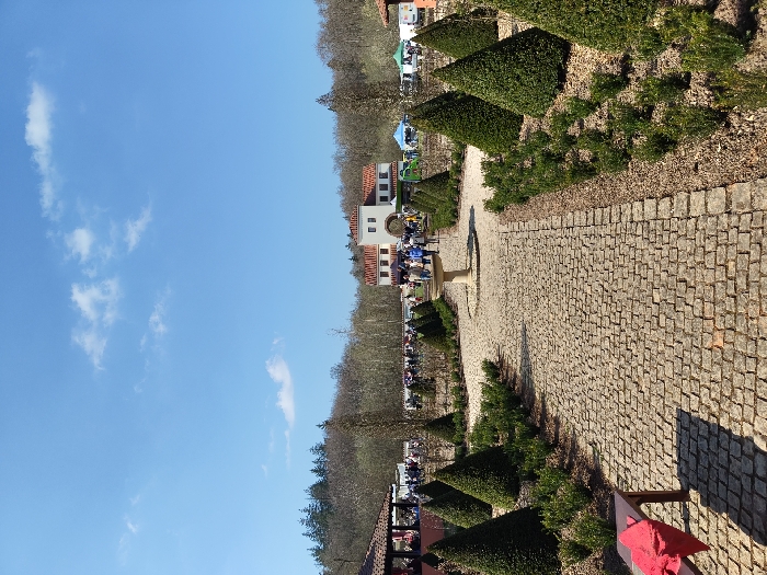 The image displays an exterior view of the Roman Villa Borg in Perl, Germany, under a clear blue sky with sparse white clouds. A light-colored cobblestone pathway traverses the scene from the foreground, leading towards a prominent white building with a red-tiled roof in the background. The pathway is flanked by landscaped garden beds containing uniformly trimmed conical topiary bushes and smaller green shrubs. In the midground, the path widens to encompass a small, circular stone fountain. A wooden bench with a folded red cloth is present on the left side of the path in the foreground. Numerous individuals, casually dressed, are observed walking and congregating in the midground and background, particularly around the villa structure and near green and white tents visible on the right. A dense line of trees, appearing to be a mix of deciduous and coniferous, forms a natural backdrop behind the villa complex.