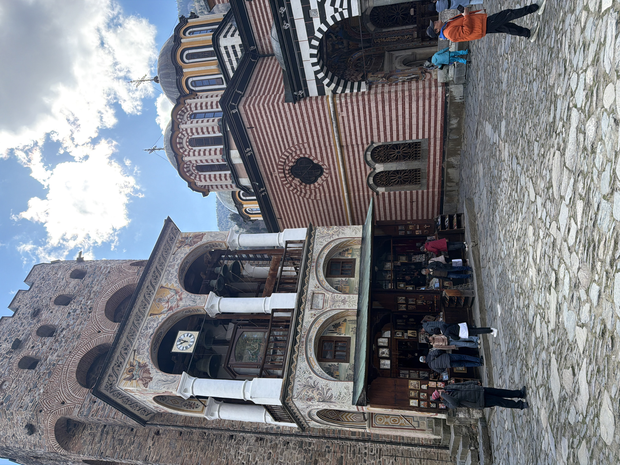 The image captures a scene at the Rila Monastery in Rilski Manastir, Bulgaria. In the foreground, a stone-paved area shows several people standing near a shop. Behind the shop, the building with a clock tower is visible. The tower has stone construction, arches, and intricate painted details. Adjacent to the tower is a building with a red and white striped facade, a circular window, and decorative black and white stripes above. Further in the background, domes of a church can be seen against a sky with clouds. People are milling around, some appearing to shop or browse.