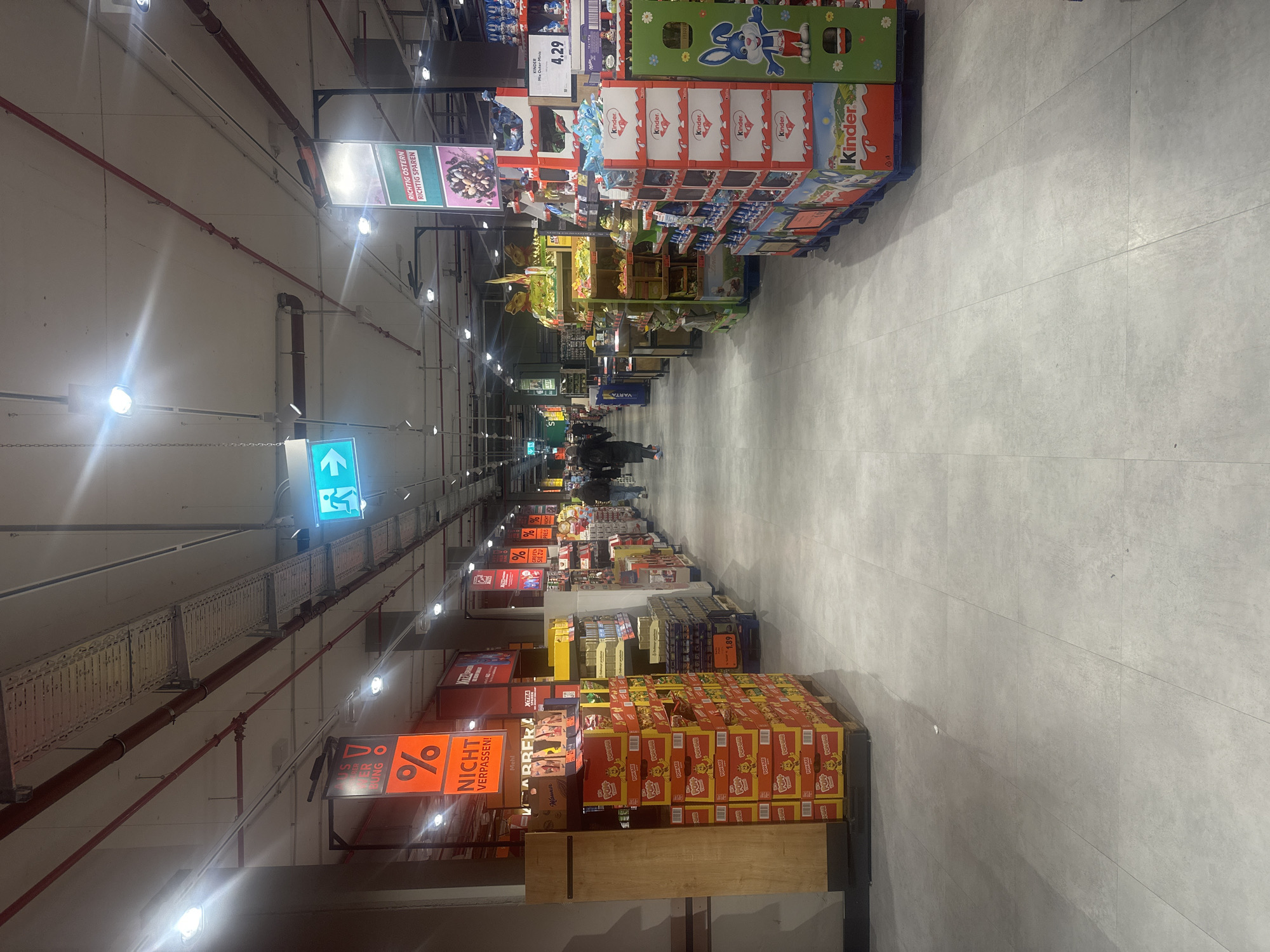 This image depicts the interior of a large grocery store, potentially in Munich, Germany, given the German text on the signage. The perspective is looking down a long aisle, characterized by a grey floor. Merchandise is stacked high on both sides, including items like Kinder products, sweets, and other food products. Signage is visible, displaying percentages and promotional offers in German. People are present further down the aisle, appearing to be customers browsing or walking through the store. A blue sign with a white arrow points towards an exit. Fluorescent lights are placed on the ceiling. The overall environment appears to be a commercial setting for retail sales.
