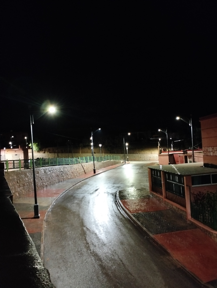 A nighttime view of a wet, winding road lined with streetlights. The road surface reflects the artificial lights, creating bright glares. A stone wall with decorative fencing runs along one side, while a building with a dark-gated enclosure stands on the other. The sky is dark, with the overall scene illuminated by the streetlights. The edges of the frame suggest an elevated perspective.