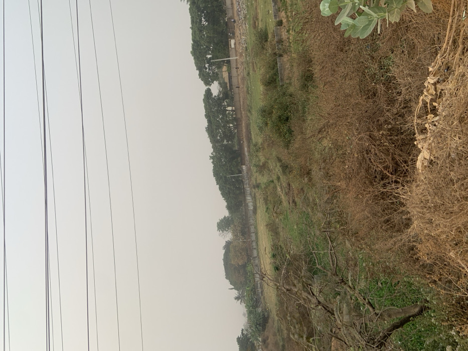 A muted landscape shows wires against a hazy sky on the left. A line of trees runs horizontally across the middle, bordering a grassy area. Dense, dry vegetation fills the right side, with scattered green patches and bare branches at the bottom. A large, leafy plant is visible in the upper right corner. The color palette is dominated by browns, greens, and grays, giving a somber, muted impression.