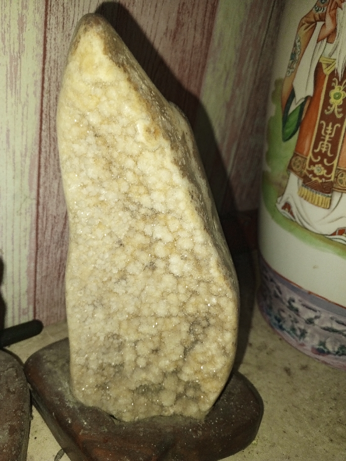 This image depicts an indoor scene, reported to be in the city of Longmiang, Laos. The central subject is an irregularly shaped, light-colored rock specimen, possibly a geode or quartz cluster, approximately two-thirds the height of the frame. Its surface is entirely covered with numerous small, sparkling, off-white to yellowish crystals, interspersed with some darker mineral inclusions or shadows. The specimen stands upright on a dark brown, rectangular wooden base with rounded edges. To the right and partially visible, a white ceramic vase is present. It is adorned with a colorful painting of a figure, specifically an elderly male with a long white beard, wearing an ornate red-orange robe detailed with green and yellow patterns. The lower section of the vase features a decorative band with wavy blue, purple, and green motifs. The background consists of vertically oriented, light-colored wooden paneling, upon which a distinct dark shadow is cast by the rock, extending to its left. No people are depicted, and no actions or interactions are discernible within the frame.