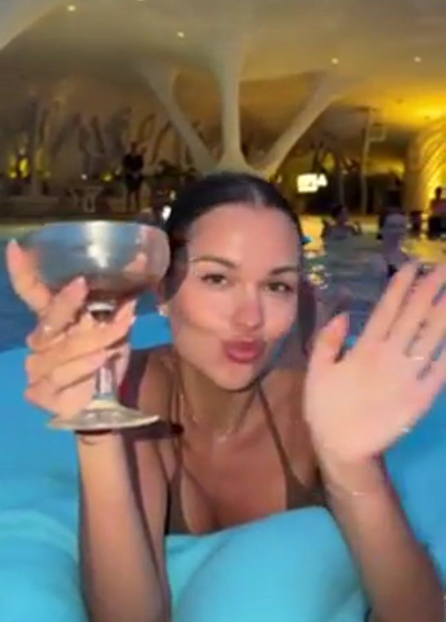 A woman in a brown swimsuit lies on a blue cushion in a pool. She holds a cocktail in a stemmed glass, pouts, and smiles at the camera. Other people are in the pool and visible in the background. The pool is lit up with bright overhead lighting, revealing an odd cavernous ceiling.