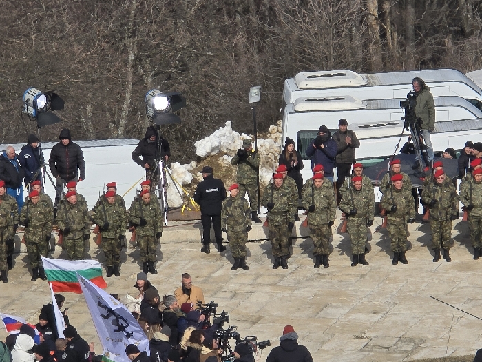 This image depicts an outdoor public gathering or event at the Shipka Memorial complex in Shipka, Bulgaria. In the mid-ground, approximately 18 men stand in a line formation on a light-colored paved surface. They wear green camouflage uniforms, dark boots, and bright red berets. Each man holds a long, wooden-stocked rifle vertically. Behind this formation, several white vans or minibuses are parked, some with rooftop carriers. Two large, blue-rimmed studio lights on black tripods illuminate the scene from the left and center-right. Several individuals, dressed in dark winter jackets, are positioned near these lights and vans; one person on an elevated platform operates a professional video camera on a tripod. Piles of residual snow and ice are visible between the vehicles and the uniformed men. A man in a black jacket marked "ОХРАНА" (Security) stands near the snow pile. In the foreground, a crowd of approximately 20-30 individuals, dressed in casual winter attire, is gathered. Among them, a prominent Bulgarian national flag (horizontal white, green, red stripes) is held, alongside a white flag featuring a black, stylized emblem and Cyrillic text. A partial view of a Russian flag is visible on the far left. At least two professional video cameras on tripods are positioned within this foreground crowd, pointing towards the uniformed men. The background consists of sparse, bare deciduous trees, indicative of winter or early spring conditions.