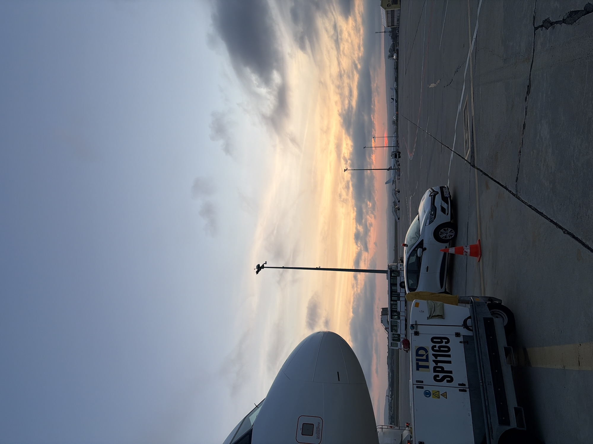 The image depicts an airport tarmac scene at Varna Airport (VAR/LBWN) in Varna, Bulgaria, during either sunrise or sunset. The sky transitions from a pale blue overhead to warm orange, pink, and yellow hues near the horizon, containing scattered dark grey clouds. In the immediate foreground on the left, the white nose and forward fuselage section of a commercial airliner are visible, partially cropped, featuring a red warning label near the cockpit. Adjacent to the aircraft, a white TLD ground support equipment unit, labeled "SP1169" and adorned with warning decals, is stationary on the tarmac. To the right of this equipment, a white Renault Clio hatchback, bearing a partially visible Bulgarian license plate, is parked. An orange traffic cone with a white reflective strip stands on the concrete tarmac near the car. The tarmac itself is dark grey, marked with white and red painted lines and exhibits surface cracks. In the midground and background, several other commercial airliners are parked on the tarmac, some partially obscured by the horizon. Multiple airport buses, tall airport lighting poles, and a yellow-sided airport building are also visible. No individuals are present in the scene.