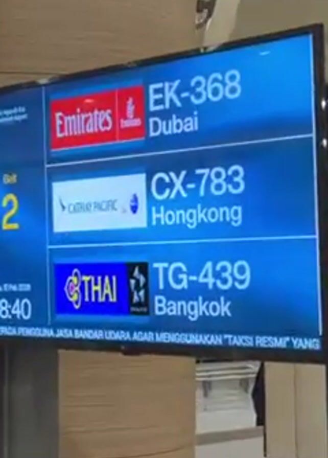 n airport information display board. The screen shows flight information for Emirates flight EK-368 to Dubai, Cathay Pacific flight CX-783 to Hong Kong, and Thai flight TG-439 to Bangkok. The display also shows the time 18:40 and mentions I Gusti Ngurah Rai International Airport. The background shows an airport terminal environment with pillars, luggage carousels, and an advertisement screen.