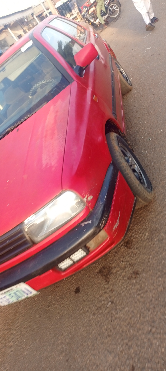 A red hatchback vehicle is positioned on an asphalt surface in Dadi Riba, Nigeria