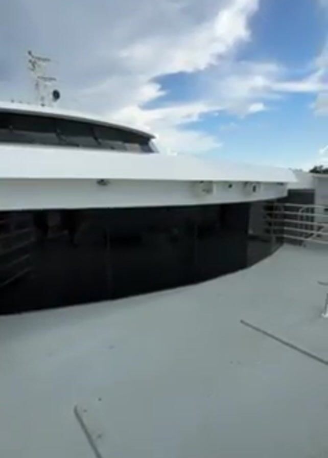 The camera pans across a white ferryboat with several passengers on board. The ferry has white seating and rails. The background shows a blue sky with puffy white clouds, water, and a shoreline with trees and mountains. There is a man standing by the rail looking at his phone.
