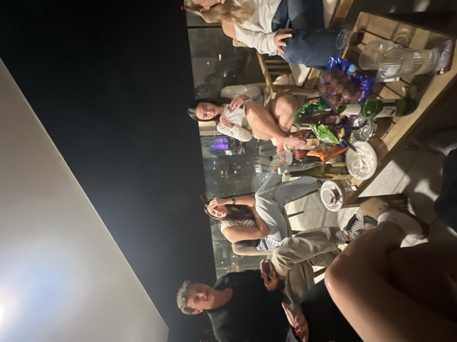 The image displays an outdoor nighttime social gathering of six young adults on a high-rise balcony in the city of Be’er-Sheva, Israel. Five individuals are seated in chairs around a rectangular wooden coffee table, with the lower legs and feet of a sixth person visible in the immediate foreground. From left to right: 1. A male, dressed in a black long-sleeved shirt over a dark undershirt and light-colored trousers, is seated, holding a smartphone or similar device in his left hand and looking towards the viewer with a slight smile. 2. A female, with long dark hair, wearing a striped sleeveless top and light blue jeans, is seated with her legs crossed. She is gesturing with her right hand near her ear, appearing to be engaged in conversation or laughter. 3. A female, with long dark hair, wearing a light-colored long-sleeved top and shorts, is seated barefoot with her legs crossed. She is focused on an object held in her hands. 4. A female, with light-colored hair, wearing an off-the-shoulder light-colored top and blue jeans, is seated, facing towards the left side of the frame. 5. Partially visible on the far left, a person wearing a dark top, holding a white rectangular object. The wooden coffee table centrally located is laden with numerous items: several empty or partially consumed glass bottles (including a wine bottle and beer bottles), a plastic Coca-Cola bottle, multiple empty glass tumblers, a green snack bag, a blue bag containing dark, spherical food items, two white bowls (one containing a white substance, likely food, and the other containing ash and cigarette butts), a small white cup with a red rim, and a lighter. The background reveals a dark night sky above a panoramic view of the illuminated city of Be’er-Sheva, seen through a glass balcony railing. Distant city lights define the urban landscape. Overhead lighting from the balcony ceiling provides illumination for the immediate gathering area.