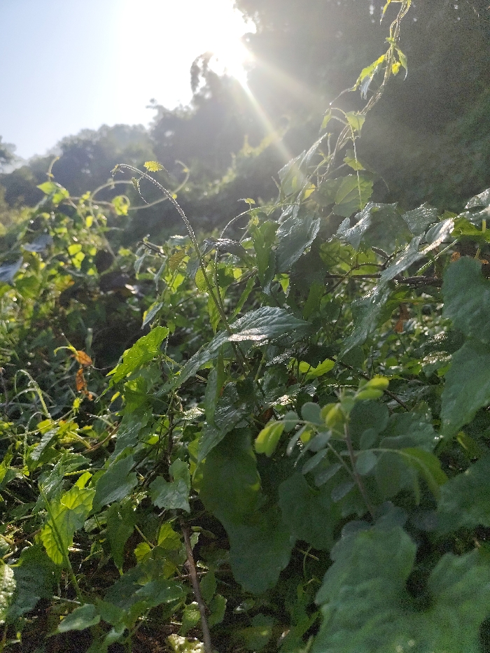 Lush green foliage glistens with dew under the sun. Vines with tendrils reach upwards. Large, heart-shaped leaves mix with smaller, rounded foliage. In the background, a hillside covered with trees is backlit by a bright sun, creating a soft, hazy glow. The focus is on the foreground plants, emphasizing their textures and vibrant color.