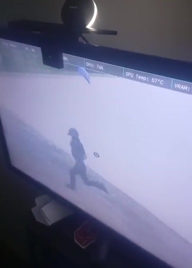 A video shows a television screen displaying a video game. The game features a character running on a white surface next to water. The screen also displays a CPU usage indicator, GPU temperature, and VR AM usage. A webcam is clipped to the top of the screen. There is some crumpled paper and a red object on the surface below the television.