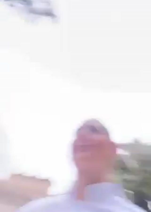 The video depicts a person walking along a path next to a green hedge. The person is wearing a white uniform, possibly a chef's coat, and dark pants. Another person, also wearing a white top and dark pants, is walking ahead on the path. The surrounding environment seems to be a garden or park-like setting, with trees and possibly a building in the background. The sky is overcast.