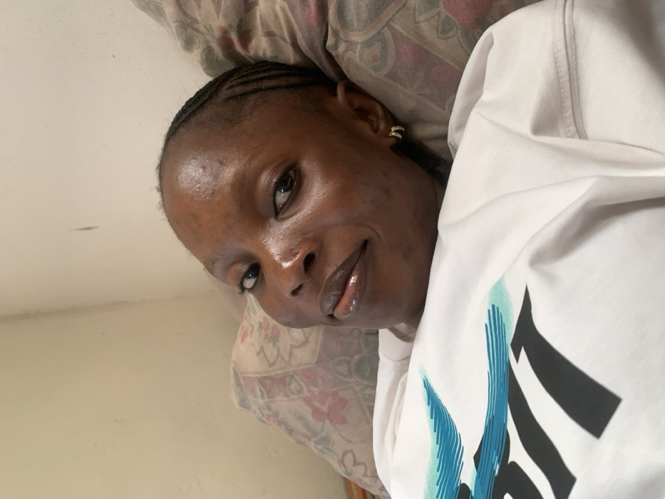 A woman lies down with her head resting on a patterned cushion. She has dark skin and braided hair pulled away from her face. She wears gold hoop earrings and shiny lip gloss. She is dressed in a white hoodie with a graphic design in black and blue. The background consists of a neutral-colored wall. The image is shot from a slightly angled, close-up perspective.