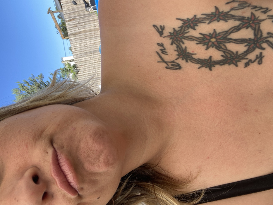 A woman’s face and upper torso are centered in the image. Her face is tilted slightly, showing her nose and lips. Her blond hair falls to the side. The background features a clear blue sky and partial view of a building. A notable tattoo is visible on her upper chest, featuring a barbed wire circle design with what appears to be a flower in the center. Words are inked below the circle. The woman is wearing a black top.