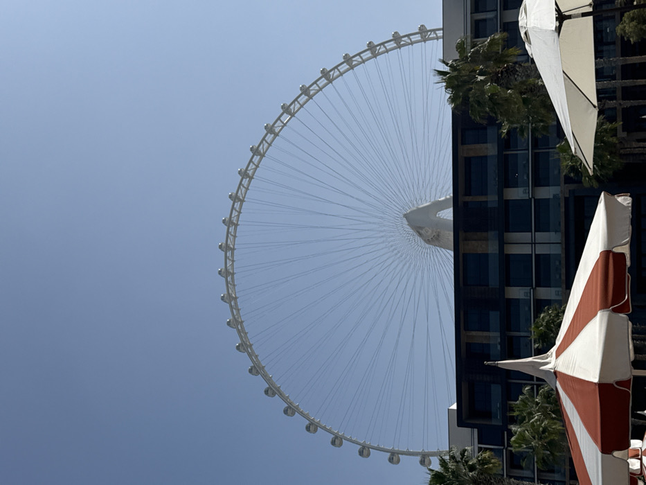 A partial view of a large Ferris wheel against a clear blue sky dominates the left side. The right side shows a modern building with dark, reflective windows, interspersed with palm trees. In the foreground, partially visible, are several white umbrellas with red accents. The Ferris wheel's structure is white with numerous spokes radiating from a central hub. The scene gives a sense of a hot, sunny day.