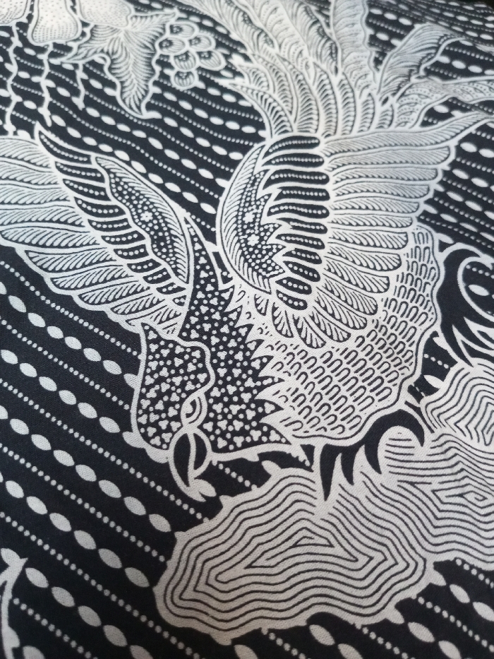 The image showcases a black and white batik-style pattern