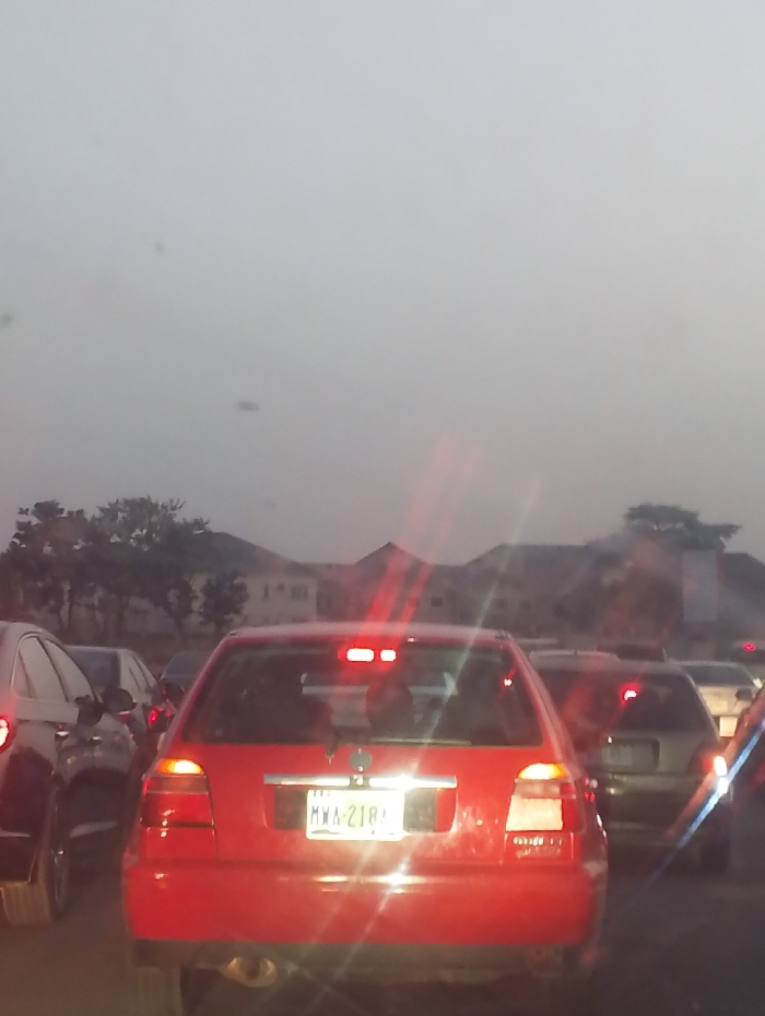 A queue of cars is caught in traffic, filling the frame. A red hatchback with a visibly illuminated license plate "MWA-218A" dominates the center. Other vehicles, varying in color, surround it. In the background, a cityscape is visible through the hazy sky, with outlines of buildings and trees vaguely discernible. The lighting suggests either early morning or late evening.