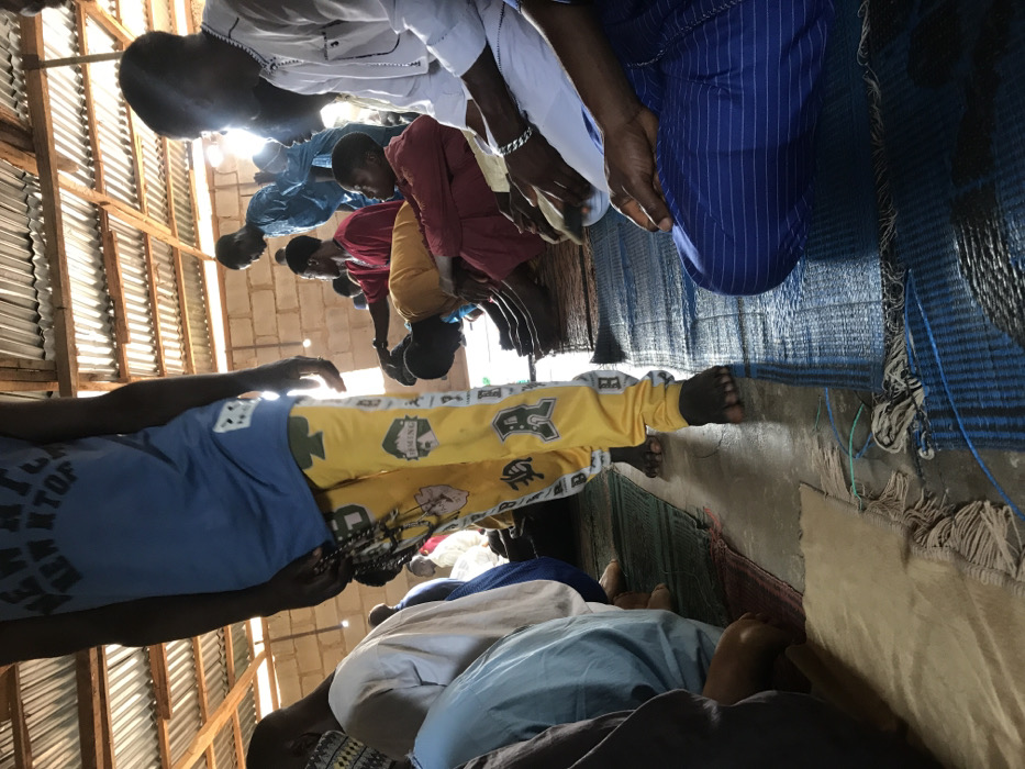 This image depicts an indoor gathering in Ago-Abo, Nigeria, within a structure featuring a corrugated metal roof supported by wooden beams and walls made of light-colored concrete blocks