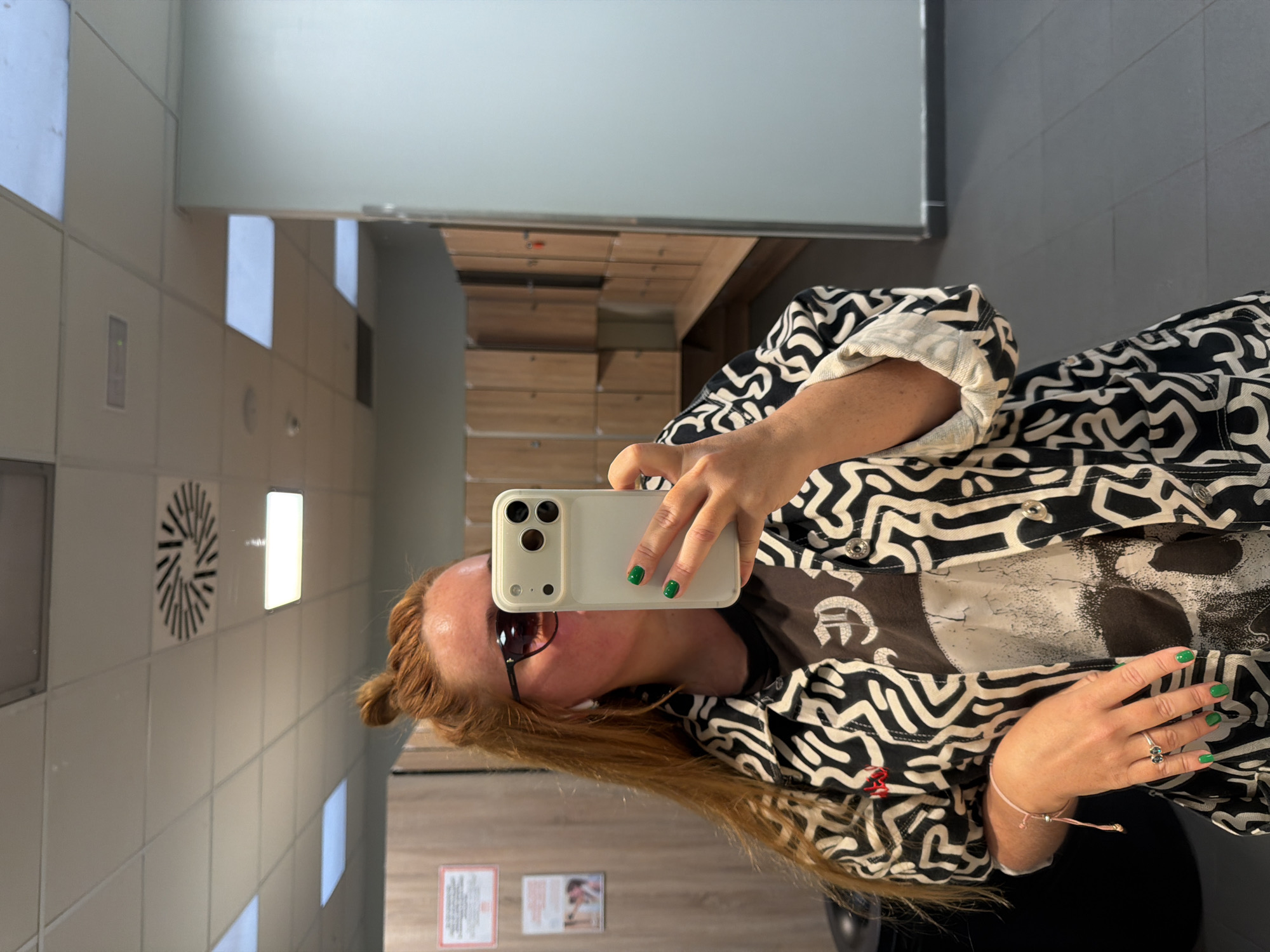 A female individual is depicted taking a mirror selfie within a locker room or changing facility in Madrid, Spain. She has long, reddish-blonde hair, partly styled in a top bun, and is wearing dark sunglasses and an AirPod in her right ear. Her face is predominantly obscured by a light-colored smartphone, featuring a triple camera system, which she holds with her right hand. Both her visible hands have bright green nail polish. On her left hand, a ring with two dark stones and a pink string bracelet are visible. She is dressed in a black and white abstract-patterned jacket over a dark t-shirt with a distressed graphic print. The background shows rows of light-colored wooden lockers, some with a long wooden bench positioned beneath them. A red-bordered sign with Spanish text, including "NORMATIVA DE USO" (Regulations for Use), is affixed to one of the locker doors on the left. The ceiling consists of light-colored suspended tiles with rectangular fluorescent lights and a circular air vent. The floor is covered with dark gray tiles.