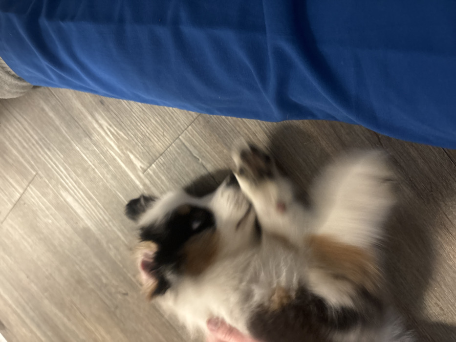 A blurred image shows a dog lying on its back on a light wood-look floor