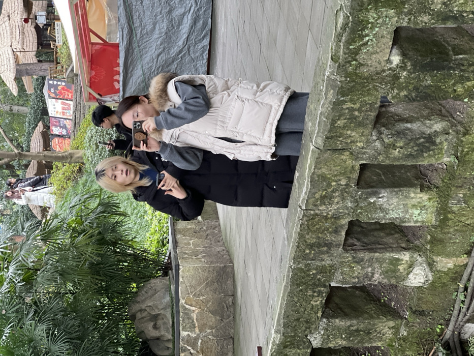 Two women and a man are taking pictures in an outdoor area. The women are standing next to each other. One is wearing a black coat, the other a light-colored vest with fur trim. They both hold phones. The man is behind them, also with a phone. Lush green foliage and a stone structure with steps surround them. In the background, there's a food stand and more greenery.