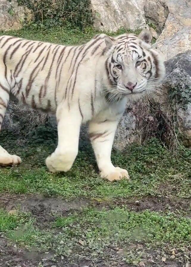white tiger walking in an enclosure. The tiger has white fur with brown stripes. The enclosure has grass, dirt, and some rocks. The tiger walks slowly, looking around, and it's captured from a close-up perspective.