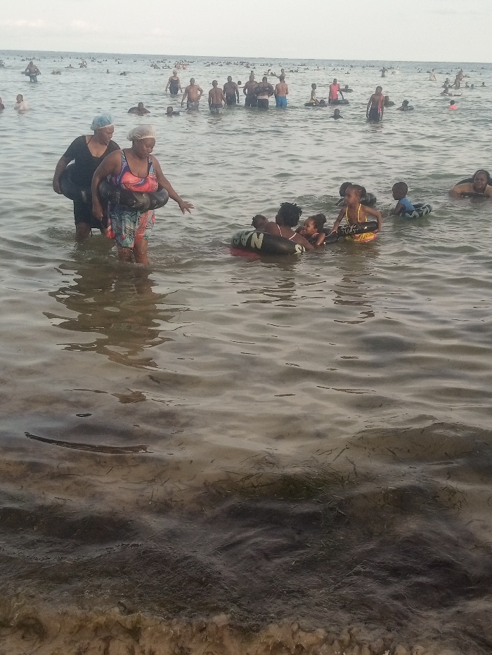 The image displays a crowded marine environment in Shanzu ward, Kenya. The foreground shows shallow, dark water with visible submerged aquatic vegetation. Two adult African females are wading in the midground. The woman on the left, wearing a dark top and a light head covering, holds a dark deflated inflatable tube under her left arm. The woman on the right, wearing a multi-colored patterned garment and a light head covering, also holds a dark deflated inflatable tube under her left arm and extends her right hand towards a group of children. Four children, including one in a yellow top, are partially submerged to their right, supported by inflatable tubes. A partially visible adult female is also present further right, supported by an inflatable tube. The background contains numerous individuals, predominantly adults, scattered across the water, many standing or wading, some utilizing inflatable aids. The horizon separates the water from a light, overcast sky. The water surface exhibits ripples and reflections.