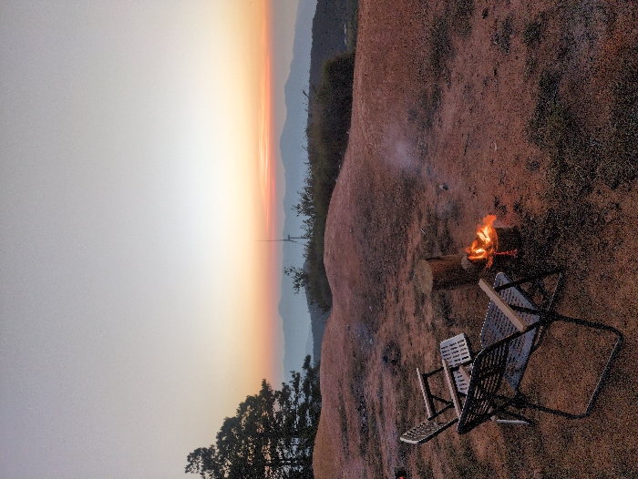 This image depicts an outdoor scene at sunset in Trường Thọ, Vietnam. The foreground features reddish-brown earth with sparse patches of dry grass, characterized by subtle undulating terrain. Two dark-framed folding camping chairs with lighter armrests are positioned facing the distant horizon. To the immediate right of the chairs, a small campfire burns with visible flames and rising smoke, situated next to a vertical tree stump. The midground consists of a ridge line covered with low vegetation. In the background, a panoramic vista of layered mountains extends to the horizon. The sky exhibits a gradient from light gray at the zenith to distinct orange and pink hues along the horizon. A tall, slender structure, consistent with a wind turbine, is visible in the distant midground, silhouetted against the colorful sky. Pine trees partially frame the left side of the scene. No individuals are present.