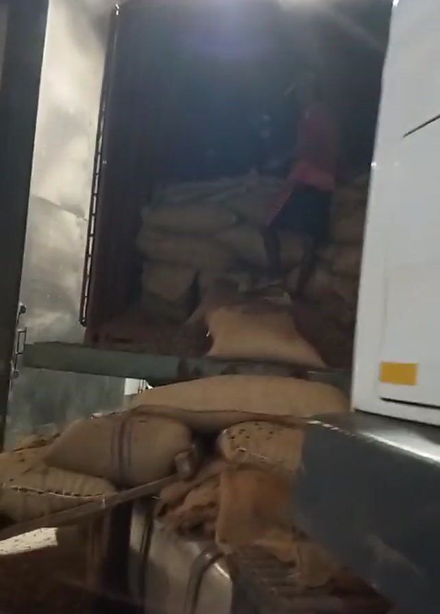 Inside a warehouse, a shipping container is being unloaded by a man in a red shirt. He climbs from the container, which is filled with burlap sacks, onto the bed of a truck. The truck bed is also filled with burlap sacks. Another man is walking away with a sack on his shoulder. The warehouse contains multiple rows of burlap sacks. There are a few overhead lights.