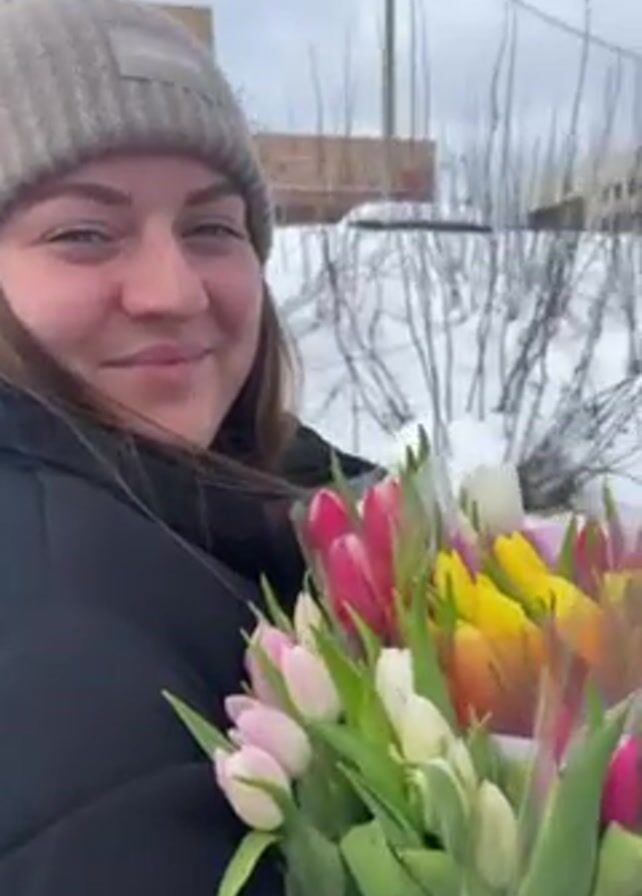 A woman stands outdoors in a snowy landscape, holding a large bouquet of colorful tulips, including pink, red, yellow, and white. She wears a beige beanie, a black jacket, and smiles slightly at the camera. In the background, there's a building and some bare trees covered in snow. The weather appears bright and sunny, with a blue sky visible.