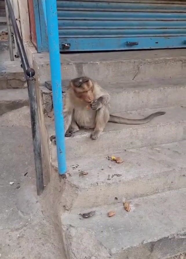 A monkey sits on concrete steps in front of a blue shutter door, chewing on food in its hand. The monkey briefly looks around and then puts its head down to look at the ground near its feet. A blue pole is beside the monkey and a motorcycle sounds in the background.