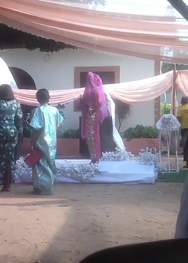 A video captures a gathering, possibly a wedding, outdoors, with individuals dressed in formal attire. A woman in a pink veil stands on a raised platform adorned with white flowers, near a two-story white building. A person in a shiny, teal-colored outfit is walking away from the platform. The setting is decorated with sheer peach-colored draping. The ground is sandy. A yellow-clad individual is standing in the background. The footage appears to be taken from within a covered area, showing parts of the structure's frame.