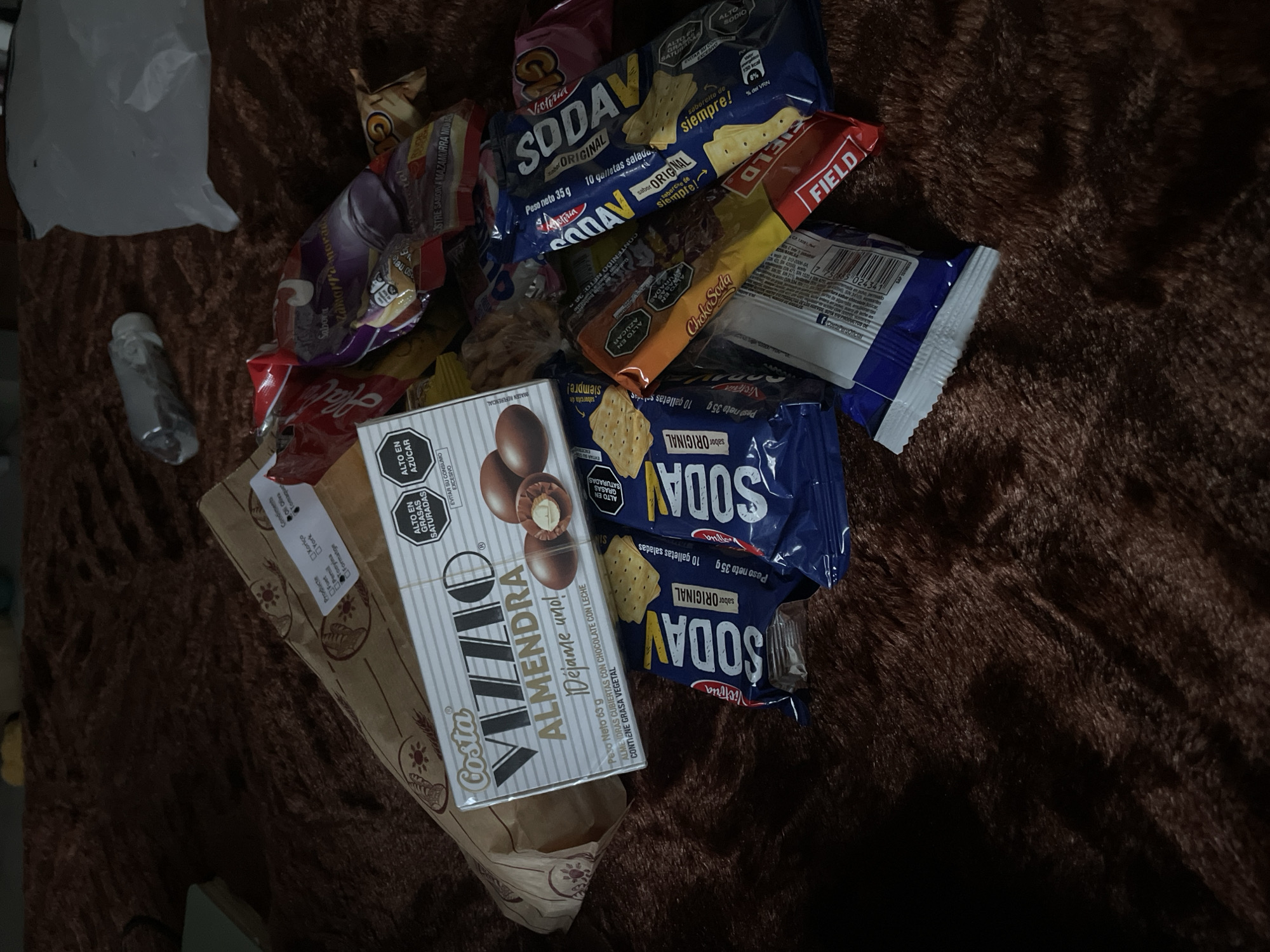 The image depicts a collection of packaged food items, primarily snacks, arranged on a dark brown, shaggy textile surface, likely a blanket or rug. This is an indoor scene. The precise location within Canet de Mar, Spain, is not identifiable from the visual content. In the foreground and center, a white cardboard box of "Costa Vizzio Almendra" (almond) chocolate-covered candies (Net Weight 63g) is prominent, displaying "Alto en Grasas Saturadas" (High in Saturated Fats) and "Alto en Azúcar" (High in Sugar) warnings. Alongside it, several blue packages of "Vicuña SODAV sabor ORIGINAL" crackers (35g each, "10 galletas saladas") are visible. An orange and red package labeled "FIELD Choko-Soda" is also present. Various other snack bags in red, purple, and yellow packaging are piled amongst these, including one purple bag indicating "Sabor Mazamorra morada." Behind the "Costa Vizzio" box, a light brown paper shopping bag, patterned with bread-like graphics and featuring a label with checkboxes for "Producte" (e.g., Pa, Cereal, Farina) and "Complements" (e.g., Oli Oliva, Formatge), is partially visible. In the upper background, on the same brown surface, a clear plastic bottle and a crumpled white plastic bag are discernible. No individuals are present, and no actions or interactions are depicted; the items are stationary.