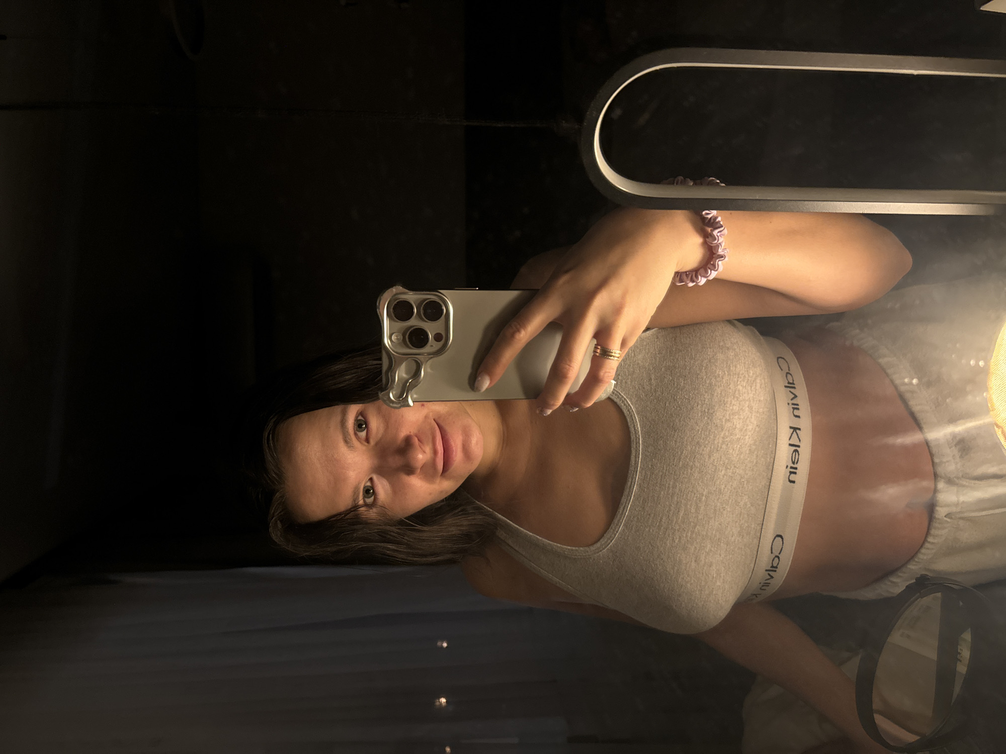A female subject is depicted in a mirror selfie taken in a dimly lit indoor environment in Vnukovo, Russia. The individual, with shoulder-length dark hair and fair complexion, is wearing a light grey Calvin Klein sports bra and light-colored sweatpants. She holds a silver-colored smartphone, consistent with an iPhone Pro Max model, in her right hand to capture the image. Her reflection shows multiple thin gold rings on her left ring finger and a pink scrunchie on her right wrist. The subject looks directly at the camera with a slight smile. An arched, silver-colored lamp or light fixture stands on the right side, providing the primary illumination. The background on the left features a light-colored curtain or fabric, while the area on the right is dark and indistinct.