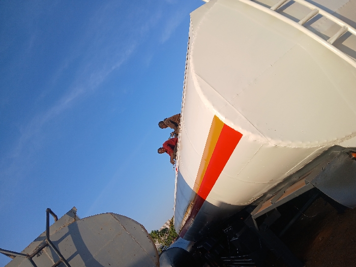 Two men stand atop a large, white tank-like structure, possibly a truck or storage container. The tank has a red and yellow stripe near its end. Metal ladders are affixed to the sides. The sky is clear blue with some wispy clouds visible in the background. A section of another similar tank is visible in the bottom left corner.
